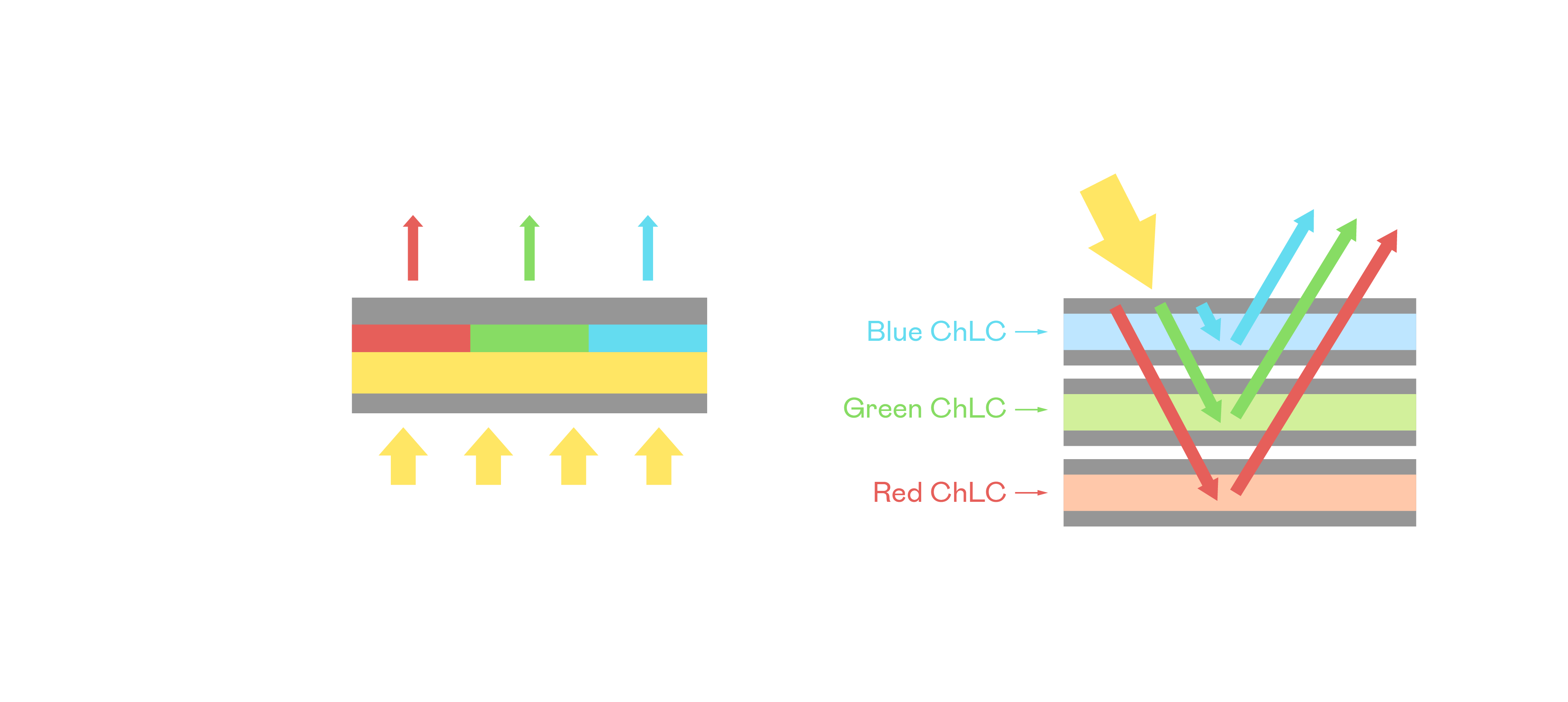 壹号娱乐胆固醇液晶显示器是由红、绿、蓝三层胆固醇液晶面板堆叠而成,并采用无彩色滤光片设计,减少环境光在反射过程中的损耗。