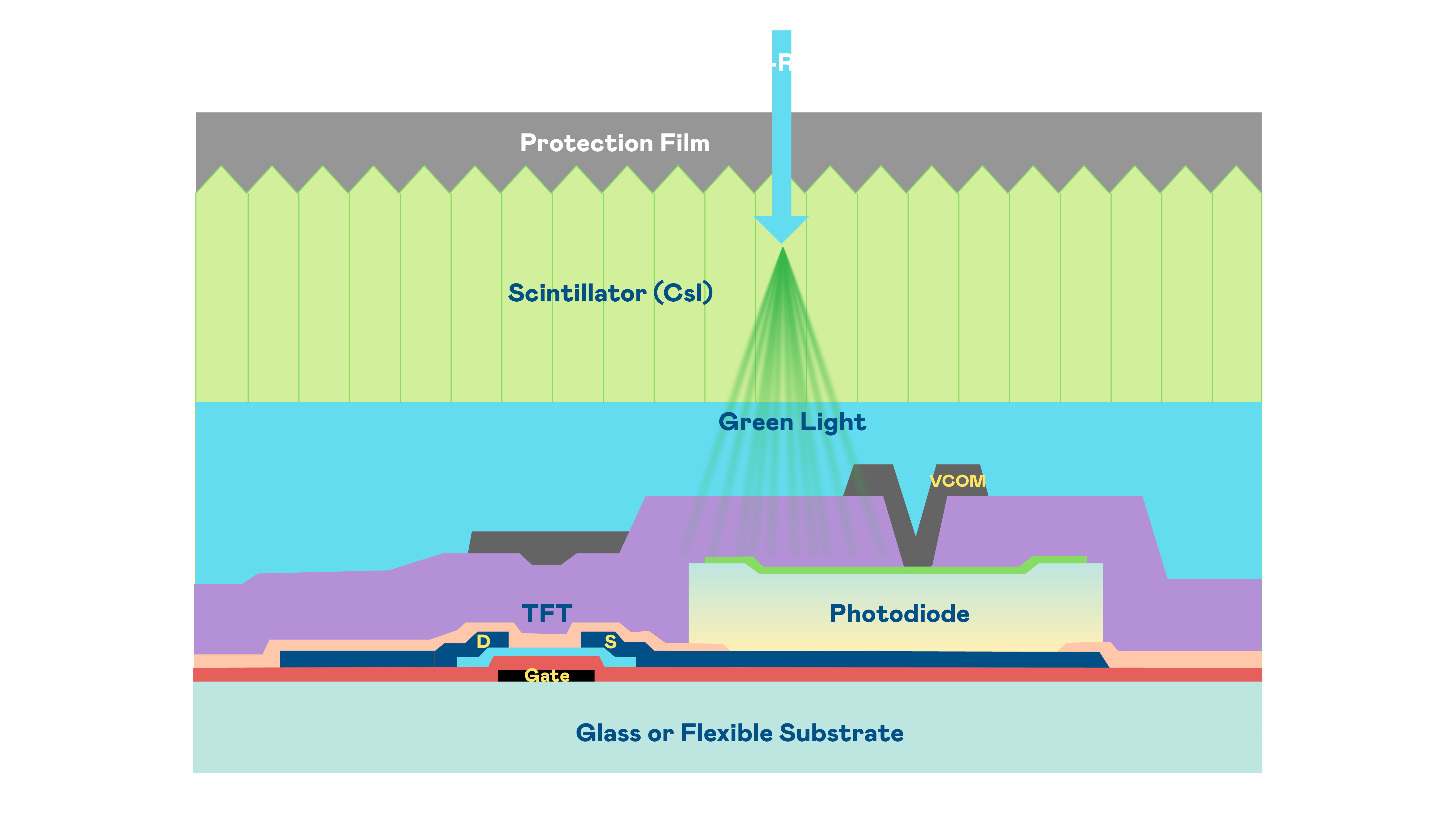 壹号娱乐的X光影像感測陣列使用薄膜電晶體 (TFT) 作為每個像素的讀取開關,搭配光電二極體(Photodiode)的光電轉換元件,用以感測X光影像訊號。
